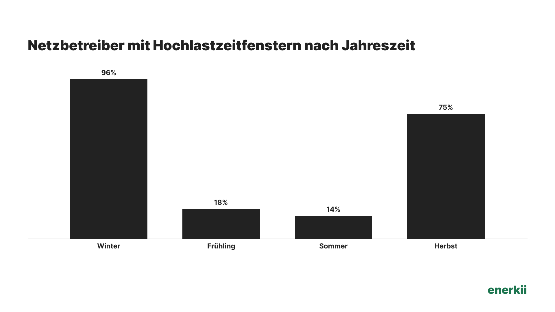 96% aller Netzbetreiber haben Hochlastzeitfenster im Winter, 75% im Herbst. Nur 18% haben Hochlastzeitfenster im Frühling, 14% im Sommer. 74% aller Netzbetreiber haben weder im Sommer noch im Frühling ein Hochlastzeitfenster.